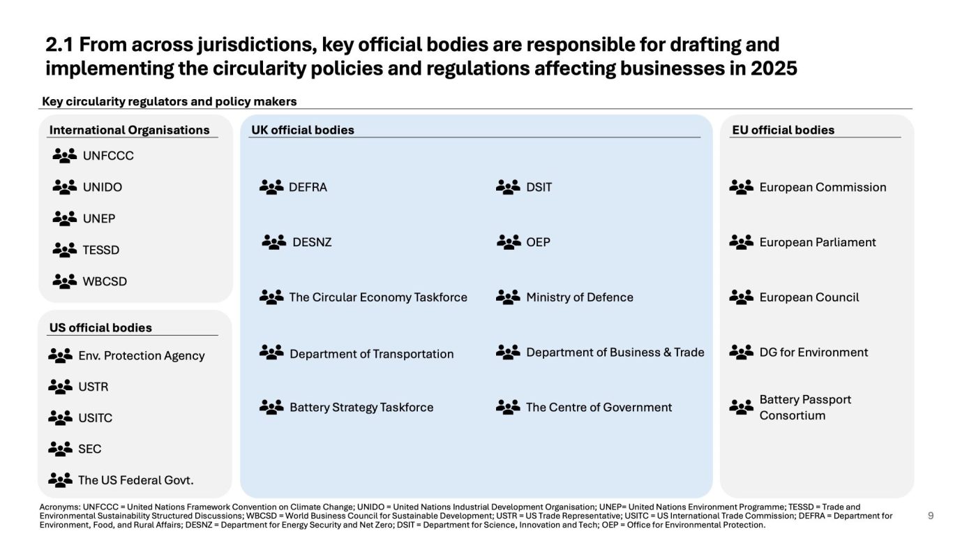 The circularity policies and regulations impacting businesses are constantly changing. As such, it is useful to map the list of public sector organisations that are actively updating these regulations. I explore this in the next section below.